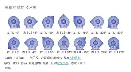 2)风机均可制成顺时针旋转或逆时针旋转两种形式,从电动机一端正视,如叶轮按顺时针方向旋转,称为顺旋风机,以“顺”表示:按逆时针方向旋转,称为逆旋转风机,以“逆”表示。